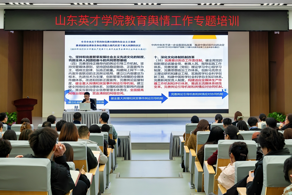 為全面提升新形勢(shì)下教育輿情的應(yīng)對(duì)與處置能力,11月26日,學(xué)校在南校區(qū)知行樓報(bào)告廳成功舉辦“全媒體時(shí)代教育輿情研判與處置”專題培訓(xùn)。山東省網(wǎng)絡(luò)安全工程師、知名高校輿情專家姜申濤應(yīng)邀作專題報(bào)告。學(xué)校各職能部門負(fù)責(zé)人、二級(jí)學(xué)院黨組織負(fù)責(zé)人、宣傳員、教師網(wǎng)評(píng)員及輔導(dǎo)員代表參加培訓(xùn)。黨委宣傳部部長(zhǎng)王坤麗主持培訓(xùn)會(huì)。