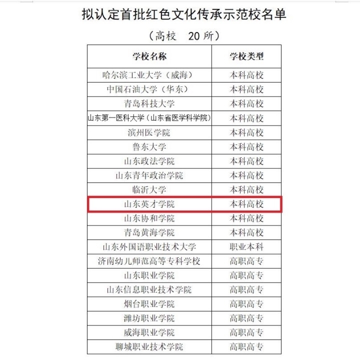 近日,山東省教育廳公布首批中華優(yōu)秀傳統(tǒng)文化傳承示范校、首批紅色文化傳承示范校名單。此次示范高校共有20所高校入選,濟(jì)南有7所。山東英才學(xué)院位列其中,獲評(píng)山東省首批紅色文化傳承示范校。