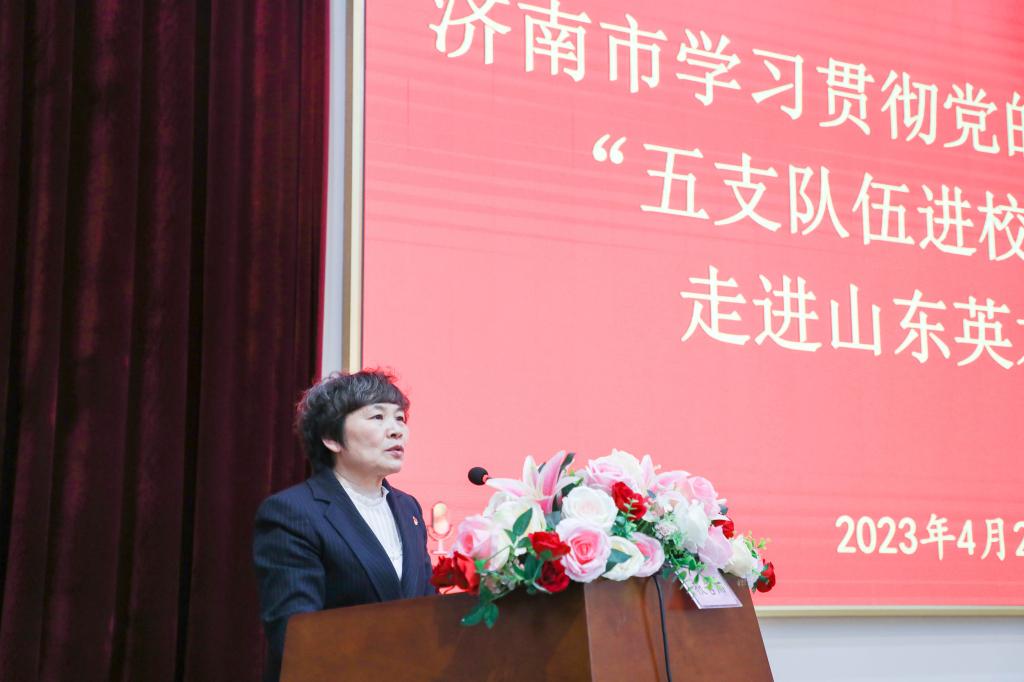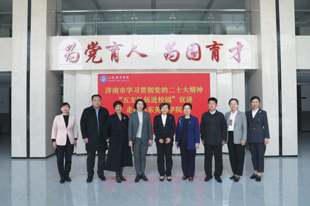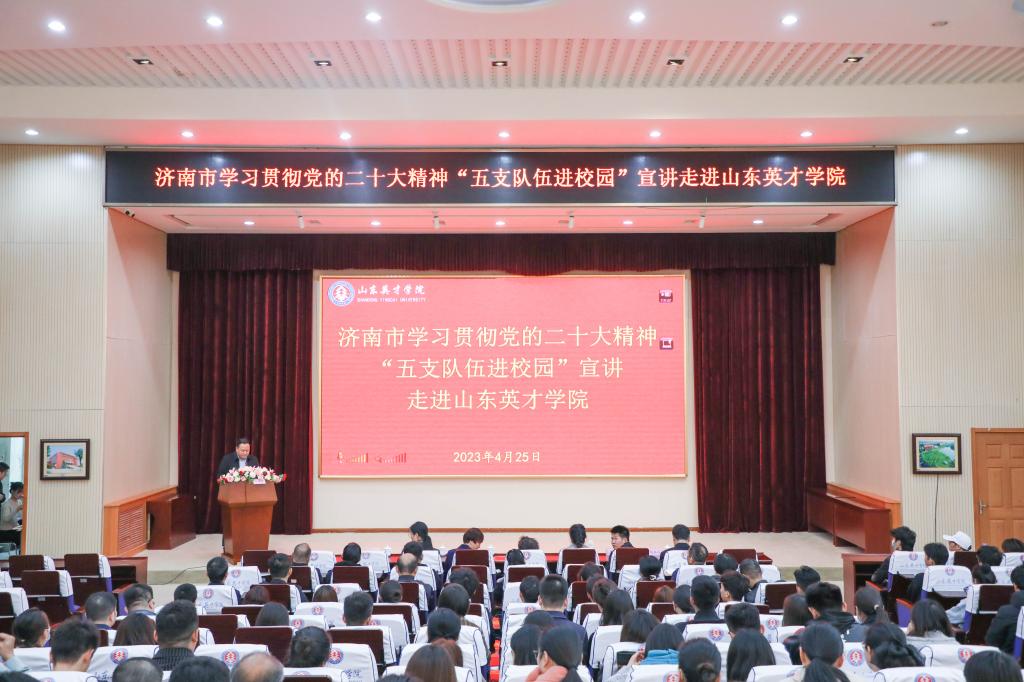 為全面深入學(xué)習(xí)貫徹黨的二十大精神,推動(dòng)學(xué)習(xí)貫徹習(xí)近平新時(shí)代中國(guó)特色社會(huì)主義思想主題教育深入開(kāi)展,4月25日,濟(jì)南市委宣講團(tuán)副團(tuán)長(zhǎng)呂桂紅、山東蓋伊爾集團(tuán)董事長(zhǎng)尚金花、濟(jì)南市濟(jì)陽(yáng)區(qū)人民醫(yī)院宣傳科主任助理朱寶慧、起步區(qū)崔寨街道辦事處王河社區(qū)工作人員李娜、萊蕪區(qū)李記隆乾誠(chéng)酸漿豆腐第七代傳承人李碩走進(jìn)山東英才學(xué)院開(kāi)展黨的二十大精神“五支隊(duì)伍進(jìn)校園”宣講活動(dòng)。宣講活動(dòng)由學(xué)校副校長(zhǎng)劉衛(wèi)東主持,學(xué)校黨政班子成員、中層干部、教職工、學(xué)生代表參加宣講會(huì)。