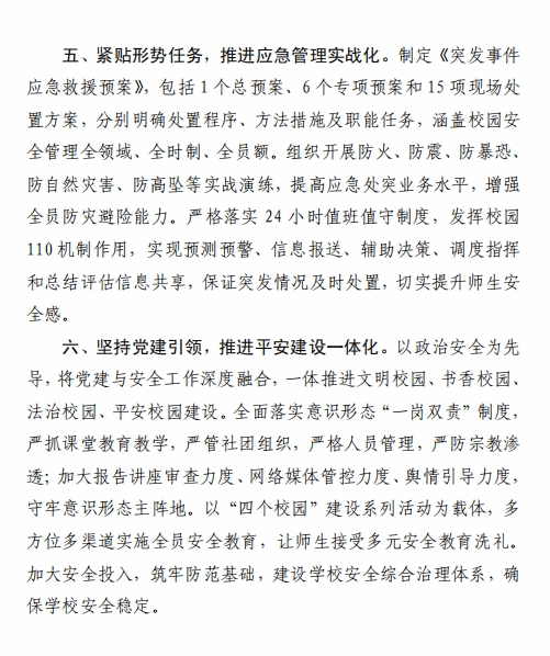 六、堅持黨建引領,推進平安建設一體化。以政治安全為先導,將黨建與安全工作深度融合,一體推進文明校園、書香校園、法治校園、平安校園建設。全面落實意識形態(tài)“一崗雙責”制度,嚴抓課堂教育教學,嚴管社團組織,嚴格人員管理,嚴防宗教滲透;加大報告講座審查力度、網(wǎng)絡媒體管控力度、輿情引導力度,守牢意識形態(tài)主陣地。以“四個校園”建設系列活動為載體,多方位多渠道實施全員安全教育,讓師生接受多元安全教育洗禮。加大安全投入,筑牢防范基礎,建設學校安全綜合治理體系,確保學校安全穩(wěn)定。