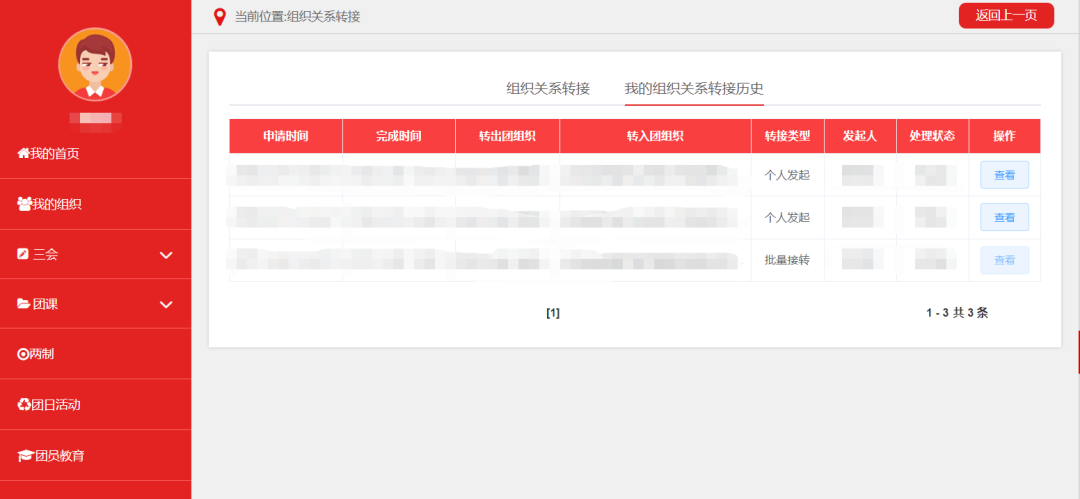 完成團關(guān)系轉(zhuǎn)接全部信息填寫后,自動跳轉(zhuǎn)至我的組織關(guān)系轉(zhuǎn)接歷史頁面,并顯示此次轉(zhuǎn)接任務,等待原所在團組織和新生團支部管理員審批通過后即完成轉(zhuǎn)接