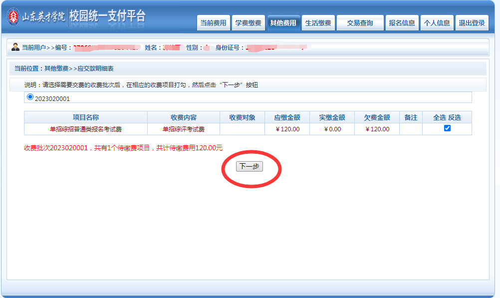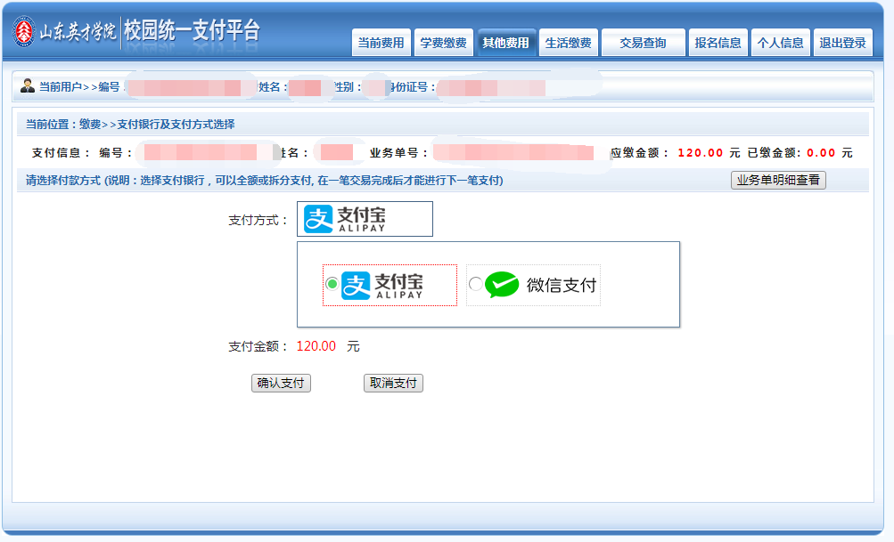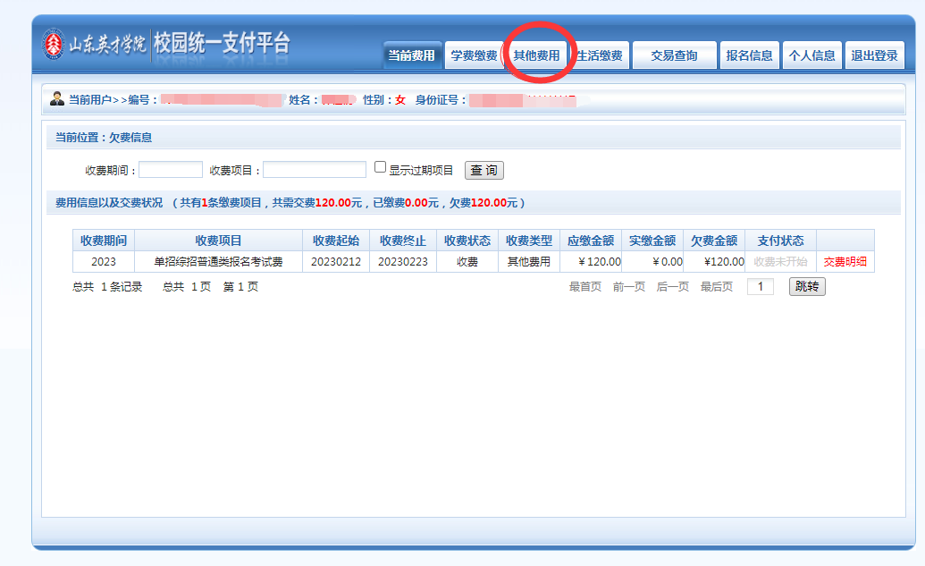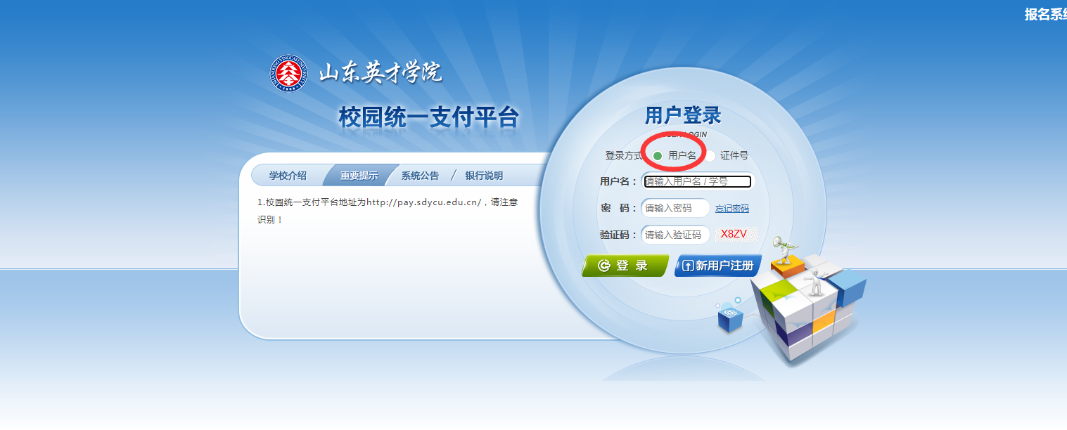 1、登錄山東英才學(xué)院網(wǎng)站首頁(yè),點(diǎn)擊浮動(dòng)窗口,進(jìn)入繳費(fèi)端口,或輸入網(wǎng)址http://pay.www.deckforma.com/。登錄方式選擇用戶名一欄。用戶名為考生身份證號(hào),密碼為考生身份證號(hào)后六位(或6個(gè)0)。綜合評(píng)價(jià)、單招普通類考試費(fèi)120元/人。退役軍人考試費(fèi)80元/人。