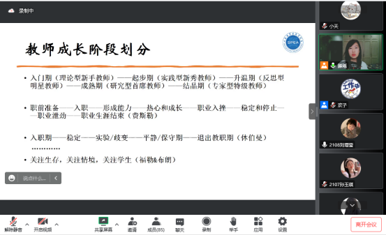 在講座上,滕瑤主任為同學(xué)們?nèi)嬖敿?xì)地分析了職業(yè)生涯中可能面臨的不同抉擇與相應(yīng)的準(zhǔn)備措施,憑借自身豐富的學(xué)習(xí)和工作經(jīng)歷為了使同學(xué)們更好的理解職業(yè)規(guī)劃,騰主任將職業(yè)規(guī)劃分成了五個方面:教師職業(yè)生涯規(guī)劃;職業(yè)生涯實證之路;教師成長階段劃分;如何走過迷茫期;永遠(yuǎn)擁有愛的能力,騰主任詳盡地講解了每一步,并結(jié)合實際向同學(xué)們闡釋了原理,為同學(xué)們提出了關(guān)于未來職業(yè)規(guī)劃的諸多建議。最后,騰主任勉勵同學(xué)們要對自己有信心,不畏懼做出選擇。