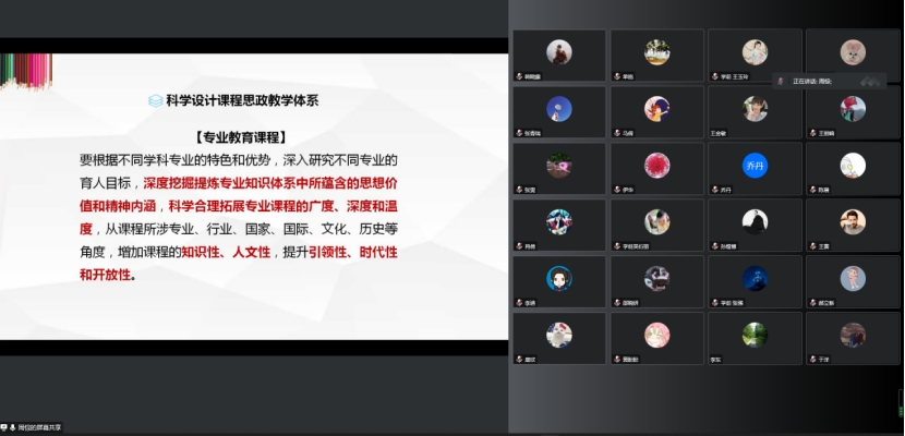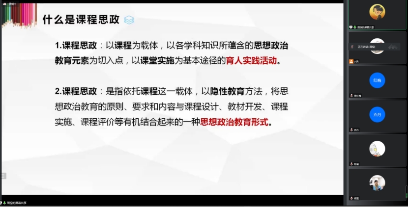 為深化“課程思政”融合設(shè)計(jì),更好地推進(jìn)“課程思政”實(shí)踐與思考,發(fā)揮課堂立德樹人的主渠道作用,學(xué)前教育學(xué)院在12月7日下午邀請(qǐng)濟(jì)南幼兒師范高等專科學(xué)校周悰副教授舉辦主題為《課程思政融合設(shè)計(jì)實(shí)踐與思考》的線上主題講座。