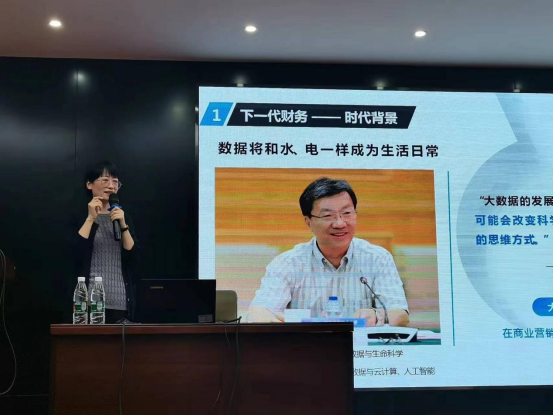 講座伊始,黃萍女士從世界經(jīng)濟形式的變化開始,介紹了下一代財務(wù)的時代背景、“十四五”數(shù)字經(jīng)濟發(fā)展規(guī)劃中國家戰(zhàn)略的支持以及數(shù)字化與智能化之間的關(guān)系,表示財務(wù)數(shù)字化轉(zhuǎn)型的關(guān)鍵要素在于釋放基礎(chǔ)核算資源、重構(gòu)財務(wù)組織功能、推動財務(wù)共享數(shù)字化轉(zhuǎn)型,解決集團數(shù)據(jù)管理問題?;跀?shù)字化實現(xiàn)智能財務(wù)的創(chuàng)新發(fā)展,從建立財務(wù)共享中心、探索創(chuàng)新數(shù)字技術(shù)應(yīng)用和智能財務(wù)應(yīng)用的角度進行分析,強調(diào)了人才轉(zhuǎn)變與職教改革的重要性。拓展了經(jīng)管類專業(yè)教師的職業(yè)視野,使學(xué)生們對數(shù)字化財務(wù)有了更進一步的了解。