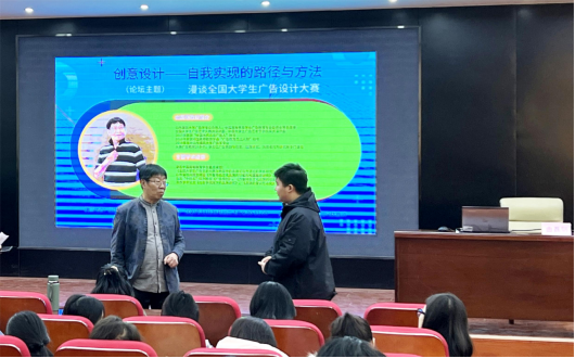 周院長對由磊明教授的到來表示熱烈的歡迎,希望由教授對我院學(xué)科競賽、專業(yè)發(fā)展等方面提出寶貴意見。講座上,由教授圍繞講座主題探討了兩個核心點“自我”與“大廣賽”,并結(jié)合藝術(shù)學(xué)、哲學(xué)、社會學(xué)等學(xué)科,提出如何看待自己的人生,引導(dǎo)大家思考未來想要成為什么樣的人,用淵博的知識有高度、有深度的為現(xiàn)場師生帶來新認(rèn)識與新思考。另外從創(chuàng)意方法和跨界本質(zhì)等方面與大賽結(jié)合,打開了師生的學(xué)術(shù)視野和創(chuàng)新意識。要求在校大學(xué)生借助大廣賽這個平臺實現(xiàn)自我,成為一個有創(chuàng)意的人。由教授言語幽默,在講解過程中不時引用實例,博得同學(xué)們的陣陣掌聲。