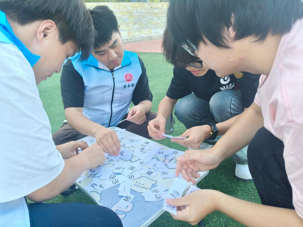 夕陽西下,主持人以清亮的嗓音喚醒現(xiàn)場:"讓我們暫別電子屏幕的熒光,在油墨芬芳里尋找詩意的棲居。"綠意盎然的操場上,師生們相聚一起,掌紋間還留著教室桌椅的木質(zhì)余溫。隨著"書名接龍"的輕快鼓點敲響,同學(xué)們圍坐成圈,依次接龍書名,現(xiàn)場氣氛迅速升溫。從《活著》到《界線》,再到《線》……一個個書名串聯(lián)起同學(xué)們腦海中的“藏書閣”。接龍“卡殼”的同學(xué)大方起身,介紹自己并分享近期在讀的書籍名稱。歡聲笑語中,大家不僅認識了新朋友,還收獲了一份長長的趣味書單。