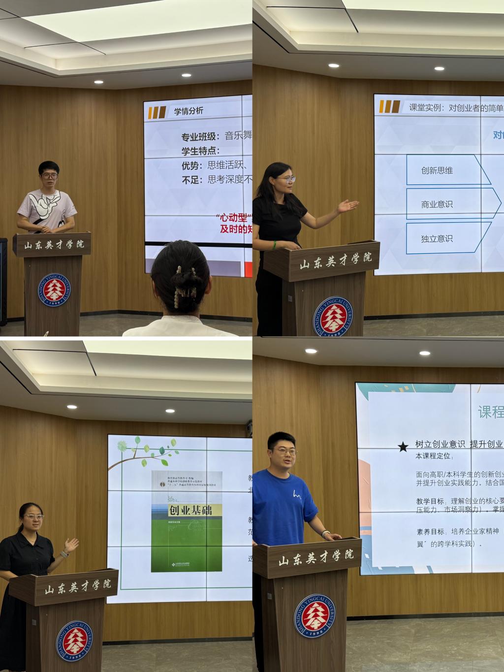 大賽設(shè)置教案評比、現(xiàn)場說課、專家提問等環(huán)節(jié)。比賽現(xiàn)場,參賽教師們準(zhǔn)備充分,結(jié)合自身教學(xué)和參賽經(jīng)歷,進行了思路清晰、內(nèi)容豐富的說課分享。如包陳雨老師通過分析所帶音樂舞蹈班級學(xué)生的特點,講述了如何將書本知識與學(xué)生專業(yè)相聯(lián)系。閆昕蕾老師講述了學(xué)生如何利用國家政策同創(chuàng)新創(chuàng)業(yè)相結(jié)合,充分展示了自己的指導(dǎo)能力。每位老師說課結(jié)束后,評委都會認(rèn)真點評,提出充實確切的改進建議?;邮降臏贤ǚ绞綖榍嗄杲處熀驮u委們搭建了一個良好的交流平臺,不僅拉進了兩者距離,也提升了青年教師的教學(xué)能力和指導(dǎo)創(chuàng)新創(chuàng)業(yè)大賽的水平。