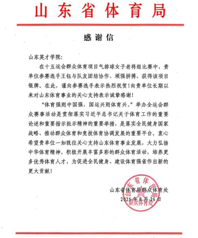 2025年8月28日,山東省體育局向山東英才學(xué)院發(fā)來(lái)感謝信,對(duì)代表山東省參賽的選手王鈺老師在中華人民共和國(guó)第十五屆全運(yùn)會(huì)群眾體育項(xiàng)目氣排球女子老將組比賽中的出色表現(xiàn)表示熱烈祝賀。