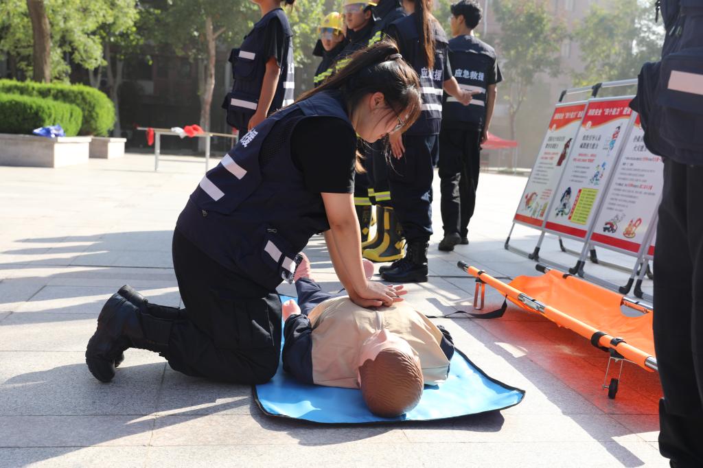 滅火實(shí)戰(zhàn)演練環(huán)節(jié),校應(yīng)急救援隊(duì)成員現(xiàn)場(chǎng)示范滅火器“提、拔、握、壓”操作步驟,并邀請(qǐng)新生代表上臺(tái)實(shí)操,手把手指導(dǎo)糾正動(dòng)作,讓新生親身體驗(yàn)滅火過(guò)程。此外,救援隊(duì)還利用模擬人體模型,詳細(xì)演示心肺復(fù)蘇緊急救護(hù)技能,從胸外按壓深度、頻率到人工呼吸操作要領(lǐng),逐一講解并現(xiàn)場(chǎng)答疑,進(jìn)一步增強(qiáng)了演練的實(shí)用性與教育效果,幫助師生掌握“黃金急救時(shí)間”的處置方法。