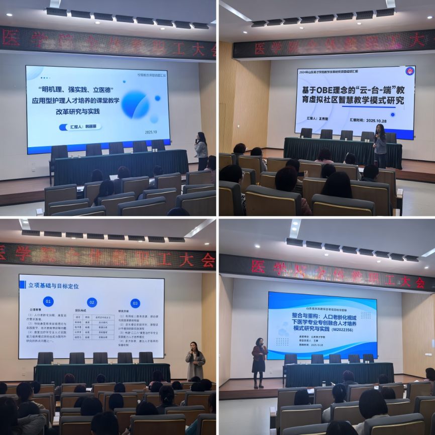 為深化教育教學(xué)改革,推動(dòng)教育教學(xué)研究高質(zhì)量發(fā)展,醫(yī)學(xué)院于2025年10月28日下午在學(xué)術(shù)報(bào)告廳成功組織召開(kāi)教學(xué)改革項(xiàng)目評(píng)審會(huì)。會(huì)議對(duì)2022-2023年立項(xiàng)的教改項(xiàng)目進(jìn)行結(jié)題驗(yàn)收,并對(duì)2025年立項(xiàng)的濟(jì)南市重點(diǎn)教改項(xiàng)目進(jìn)行開(kāi)題評(píng)審。評(píng)審會(huì)由專(zhuān)家組組長(zhǎng)盧傳華教授主持,校督導(dǎo)高琳琳教授、程桂玲教授及校內(nèi)外專(zhuān)家王世芳、張薇薇、蘇凈、徐洪巖、徐莉共同參與評(píng)審。