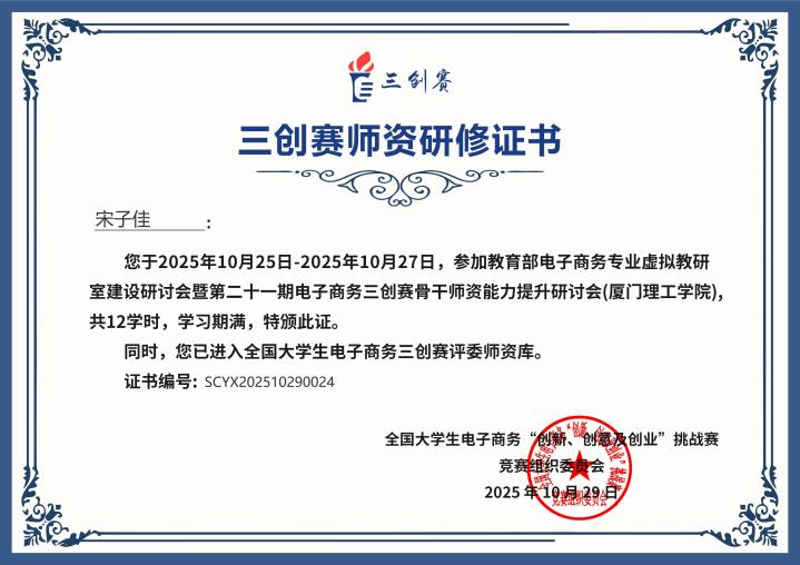 近日,第二十一期電子商務(wù)“三創(chuàng)賽”骨干師資能力提升研討會在廈門成功舉辦。我校商學(xué)院(國際學(xué)院)宋子佳老師作為骨干師資代表受邀參會,與來自全國百余所高校的專家學(xué)者、行業(yè)精英齊聚一堂,圍繞電子商務(wù)專業(yè)建設(shè)、三創(chuàng)賽制革新與產(chǎn)教深度融合等核心議題進(jìn)行了深入交流與研討。