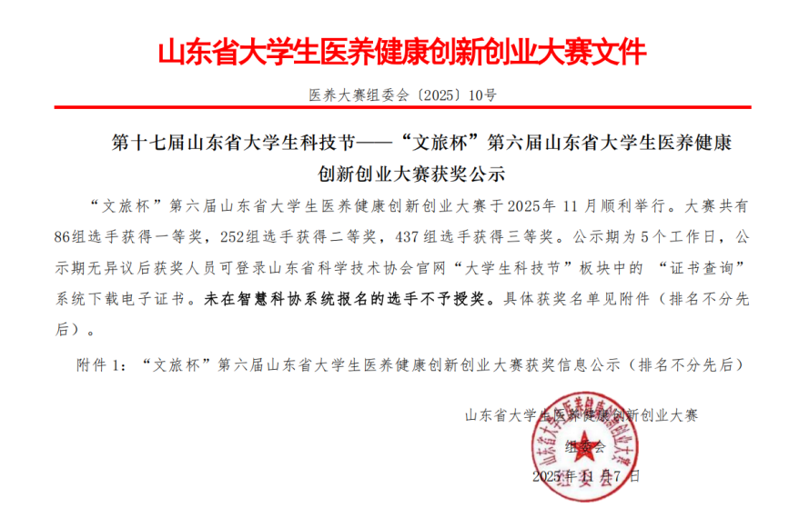 2025年11月5日—11月7日,第十七屆山東省大學(xué)生科技節(jié)“文旅杯”第六屆山東省大學(xué)生醫(yī)養(yǎng)健康創(chuàng)新創(chuàng)業(yè)大賽決賽在曲阜遠(yuǎn)東職業(yè)技術(shù)學(xué)院高鐵校區(qū)圓滿舉行。本次大賽聚焦行業(yè)痛點(diǎn)與民生需求,來自全國13個(gè)省份74所院校的870支隊(duì)伍、近8000名優(yōu)秀學(xué)子晉級(jí)決賽,我校醫(yī)學(xué)院參賽項(xiàng)目脫穎而出,成功斬獲兩項(xiàng)省級(jí)榮譽(yù)。
