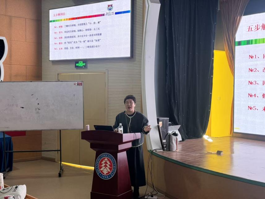 張文清園長圍繞專業(yè)發(fā)展、職業(yè)規(guī)劃和園所特色展開分享。她指出,0-6歲是人生“打底色”的關(guān)鍵階段,學(xué)前教育工作者不僅是知識的傳授者,更是兒童好奇心與創(chuàng)造力的培育者,承擔(dān)著連接家庭與社會的“教育共同體”角色。她還介紹了“五步解法”職業(yè)成長工具,幫助學(xué)生從困境拆解到行動落實,明確職業(yè)發(fā)展路徑。