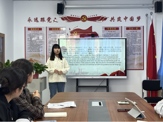 讀書會上,每位成員用雙語進行朗讀,主講人重點圍繞“上海精神”進行詳細講解,讓同學們了解“上海精神”的互信、互利、平等、協(xié)商、尊重多樣文明、謀求共同發(fā)展。通過小組討論,蔡舟、劉雅晴、蘇翔三位代表上臺發(fā)表了對“上海精神”的看法,紛紛表示要將“上海精神”融入到未來學習生活中,凝聚共識、深化合作、創(chuàng)造新一代大學生的新活力。