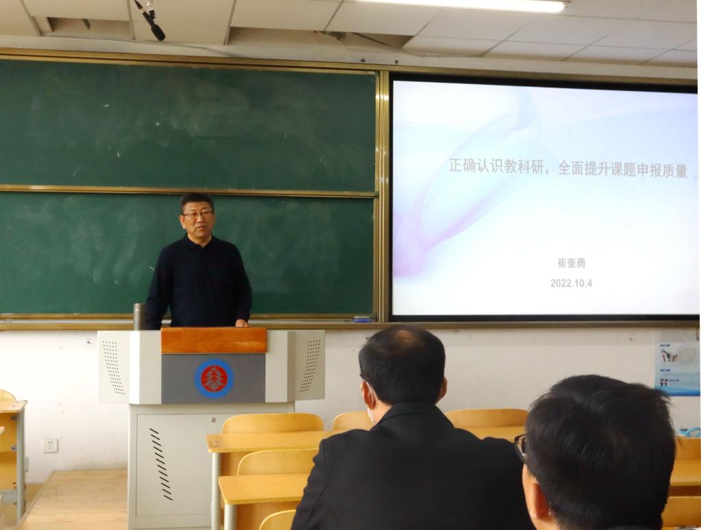 院長盧傳華介紹了崔校長的學(xué)術(shù)成果,并代表醫(yī)學(xué)院全體師生對崔校長的到來表示熱烈歡迎和誠摯感謝。崔奎勇副校長以《正確認(rèn)識教科研,全面提升課題申報質(zhì)量》為題,結(jié)合自身多年教育教學(xué)及科研經(jīng)驗,就如何正確認(rèn)識教科研、提升科研課題申報質(zhì)量、如何正確認(rèn)識課題獲批以及我??蒲行伦兓乱笏膫€方面進(jìn)行詳細(xì)闡述,并對課題申報材料的撰寫進(jìn)行重點講解,從課題提出、內(nèi)容設(shè)計、研究過程到成果與成效以及研究展望,內(nèi)容豐富、系統(tǒng)全面。該講座既有具體的理論指導(dǎo),又有生動的案例分析,實用性和可操作性強,為參培人員開展課題研究提供了寶貴的理論依據(jù)和實踐指導(dǎo)。