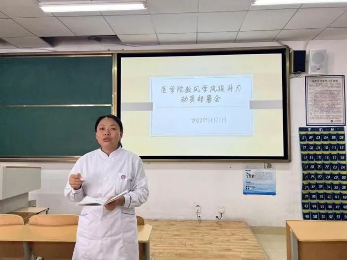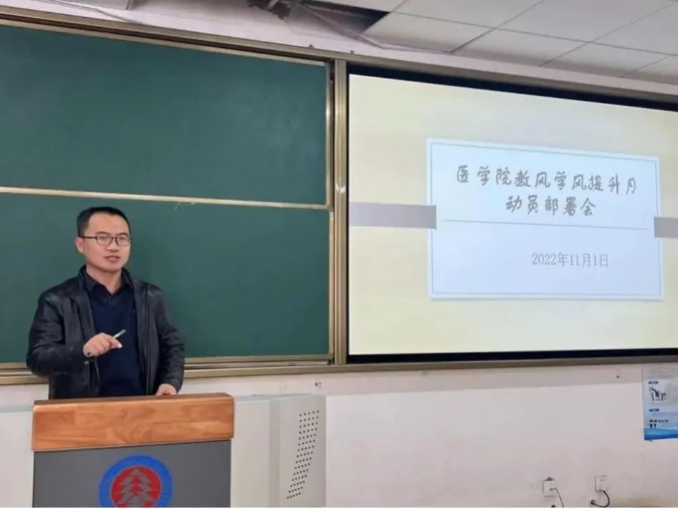 為進(jìn)一步加強(qiáng)學(xué)風(fēng)建設(shè),樹立良好學(xué)風(fēng),保障教學(xué)的良好運(yùn)行,營(yíng)造良好的育人環(huán)境和學(xué)習(xí)氛圍。我院于2022年11月1日在醫(yī)學(xué)院2008教室召開“教風(fēng)學(xué)風(fēng)提升月動(dòng)員部署會(huì)”。參加本次會(huì)議的有醫(yī)學(xué)院黨總支副書記武玉興 、教學(xué)秘書王曼、考務(wù)秘書秦春晶、實(shí)訓(xùn)中心主任王輝等醫(yī)學(xué)院教師及全體輔導(dǎo)員。