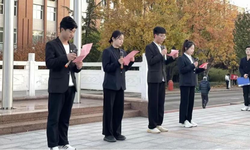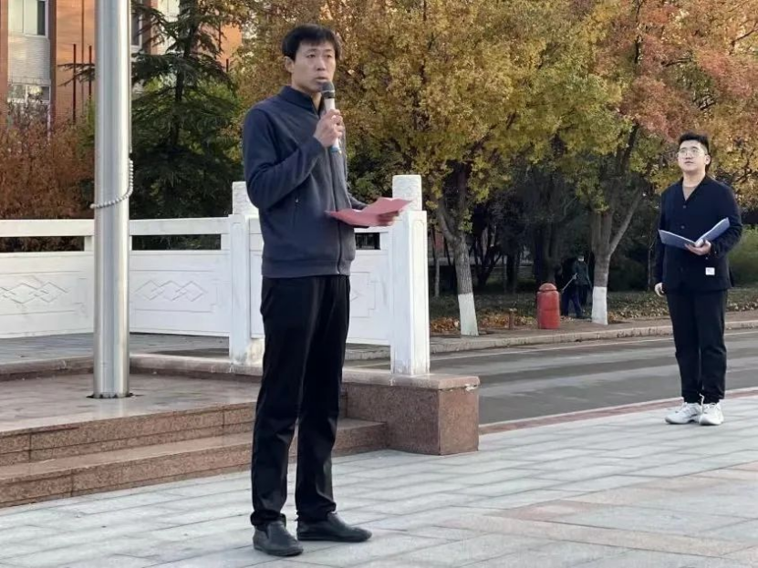 緊接著,學(xué)院四名學(xué)生代表朗誦《送色》為全體同學(xué)同上 “國旗下的思政課”。隨后,音樂舞蹈學(xué)院直屬黨支部書記祝景朋以“爭做有理想、敢擔(dān)當(dāng)、能吃苦、肯奮斗的新時代好青年”為主題發(fā)表講話。他對同學(xué)提出三點希望:一是堅持“敢”字當(dāng)頭,扛起新一代青春責(zé)任;二是練就過硬本領(lǐng),以黨的二十大精神為指引,在新征程中綻放絢麗之花;三是要堅定不移聽黨話、跟黨走,立志做有理想、敢擔(dān)當(dāng)、能吃苦、肯奮斗的新時代好青年!