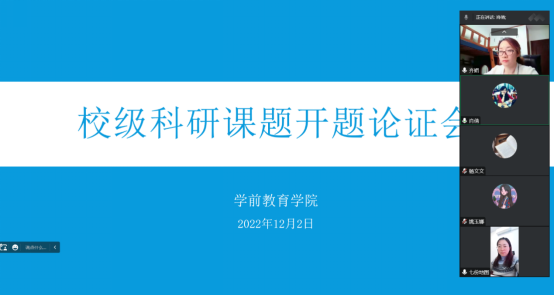 根據(jù)校級(jí)科研課題的研究進(jìn)度和部署,2022年12月2日,學(xué)前教育學(xué)院舉行了在線(xiàn)的開(kāi)題論證會(huì),邀請(qǐng)學(xué)院學(xué)術(shù)委員會(huì)的9位專(zhuān)家委員對(duì)2022年度立項(xiàng)的10項(xiàng)科研課題進(jìn)行了開(kāi)題論證,各項(xiàng)目的負(fù)責(zé)人及骨干成員參加了本次論證會(huì)。