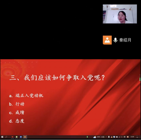 秦紹月老師以《我的入黨路以及背后的中國(guó)夢(mèng)》為題,結(jié)合自己的成長(zhǎng)經(jīng)歷,給大家?guī)?lái)了精彩的一課。她以“青年,你為什么要入黨?”這一問(wèn)題為開端,鼓勵(lì)大家全身心投入到共產(chǎn)主義的事業(yè)中,為學(xué)院發(fā)展、祖國(guó)騰飛、為中華民族的強(qiáng)大貢獻(xiàn)一份微薄而堅(jiān)強(qiáng)的力量。
