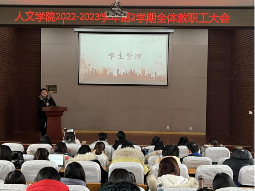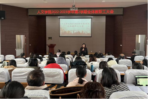 隨后,王靜副院長做新學(xué)期初期教學(xué)工作安排。王院長首先介紹了人文學(xué)院新入職的教師,各位老師進(jìn)行自我介紹;隨后,對人文學(xué)院2022年度教學(xué)、科研等工作進(jìn)行總結(jié);最后,對本學(xué)期重點(diǎn)工作進(jìn)行部署,希望大家在新學(xué)期能夠全力以赴做好本科評估相關(guān)工作、教學(xué)及科研工作。