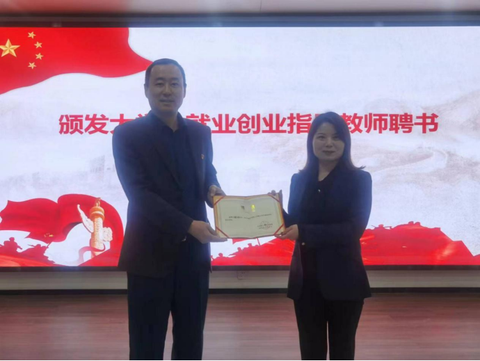 我院黨總支書記許鵬同志為穆引妮老師頒發(fā)大學(xué)生就業(yè)創(chuàng)業(yè)指導(dǎo)教師聘書。許書記指出,希望穆老師持續(xù)關(guān)注我院學(xué)生的成長成才,幫助更多的畢業(yè)生錨定人生方向。