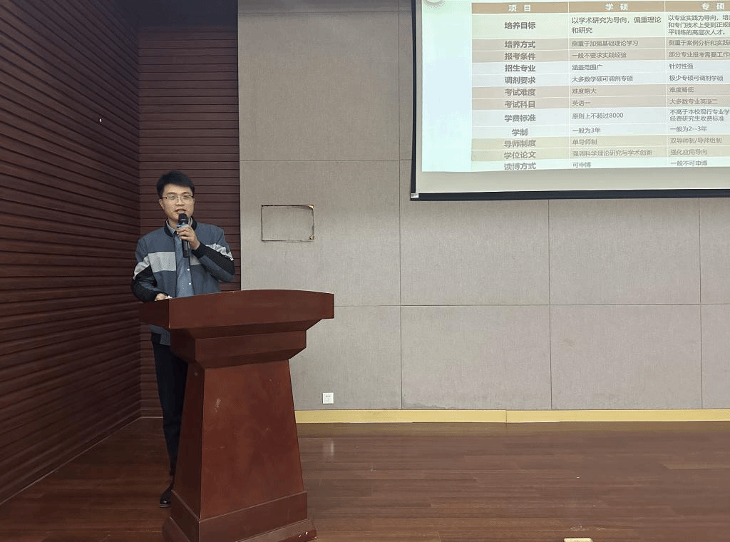 考研不僅是對自己的一次歷練和考驗,也是一個全新的開始,為將來就業(yè)爭取更多選擇的機會。張老師生動細致解答了同學們在了解考研、準備考研中的困惑和迷茫。他強調,考研是一場硬仗,唯有堅持才能最終實現(xiàn)自己的目標,鼓勵同學們勇于挑戰(zhàn),早做準備。