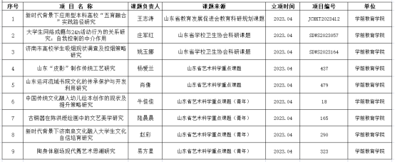 近日,山東省藝術(shù)科學(xué)重點(diǎn)課題評(píng)審辦公室、山東省教育發(fā)展促進(jìn)會(huì)、山東省學(xué)校衛(wèi)生協(xié)會(huì)陸續(xù)公布了2023年度科研課題立項(xiàng)名單,我院9位老師喜獲立項(xiàng),其中牛佳佳,陸晨晨,趙彩,易方星老師獲批山東省藝術(shù)科學(xué)青年課題;楊愛(ài)蘭,肖倩老師獲批山東省藝術(shù)科學(xué)重點(diǎn)課題;王志濤院長(zhǎng)獲批山東省教育發(fā)展促進(jìn)會(huì)2023年度教育科研規(guī)劃課題;莊軍紅、姚玉娜老師獲批山東省學(xué)校衛(wèi)生協(xié)會(huì)2023年度科研課題。