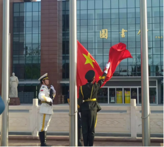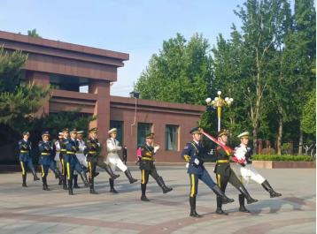升旗儀式開始,山東英才學(xué)院兄弟連國(guó)旗中隊(duì)出旗。他們身著白藍(lán)綠的軍裝,昂首闊步,在陽光的照射下熠熠生輝,以飽滿的精神狀態(tài)護(hù)送五星紅旗入場(chǎng)。升國(guó)旗,奏國(guó)歌,五星紅旗在眾人的注視下冉冉升起,在太陽的照耀下,隨風(fēng)飄揚(yáng)。