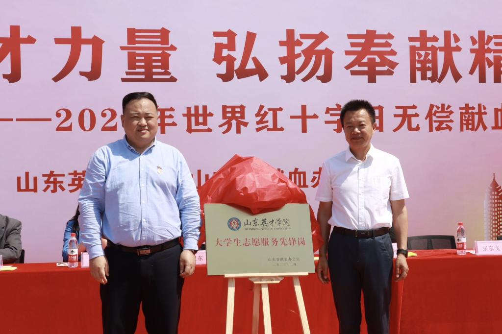 山東省紅十字會(huì)黨組成員、秘書長(zhǎng)汪洋和山東英才學(xué)院黨委委員、副校長(zhǎng)劉衛(wèi)東為山東英才學(xué)院大學(xué)生志愿服務(wù)先鋒崗揭牌。