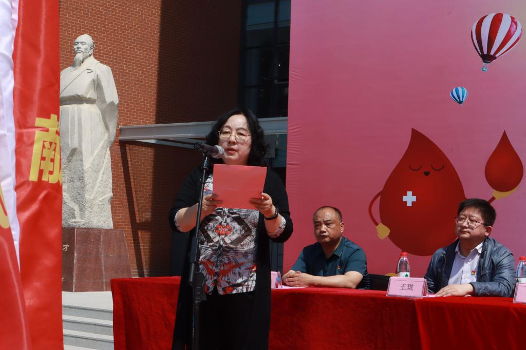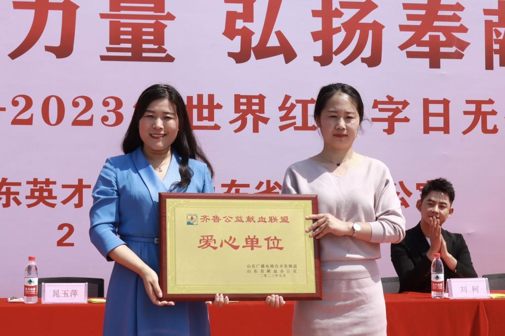 山東省鄉(xiāng)村振興基金會(huì)副秘書長(zhǎng)、山東健康咨詢網(wǎng)總編輯、齊魯公益獻(xiàn)血聯(lián)盟副主席晁玉萍為學(xué)校頒發(fā)齊魯公益獻(xiàn)血聯(lián)盟愛心單位獎(jiǎng)牌。
