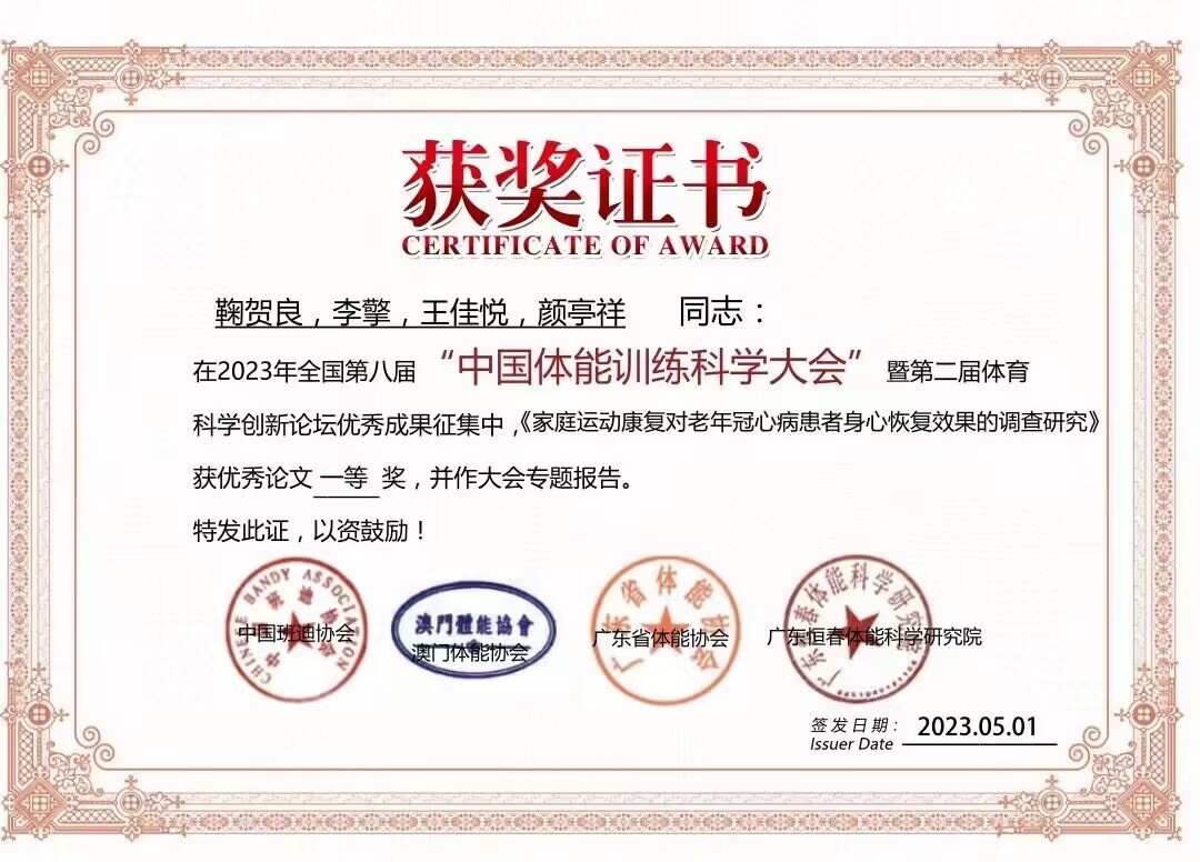5月1日,在2023年全國第八屆“中國體能訓(xùn)練科學(xué)大會(huì)”暨第二屆體育科學(xué)創(chuàng)新論壇優(yōu)秀成果征集活動(dòng)中,醫(yī)學(xué)院由指導(dǎo)老師顏亭祥,學(xué)生鞠賀良、李擎、王佳悅共同組成的參賽隊(duì)伍憑借《家庭運(yùn)動(dòng)康復(fù)對(duì)老年冠心病患者身心恢復(fù)效果的調(diào)查研究》一舉榮獲優(yōu)秀論文一等獎(jiǎng),并在線上做了精彩分享,與各校學(xué)者進(jìn)行了深入交流。