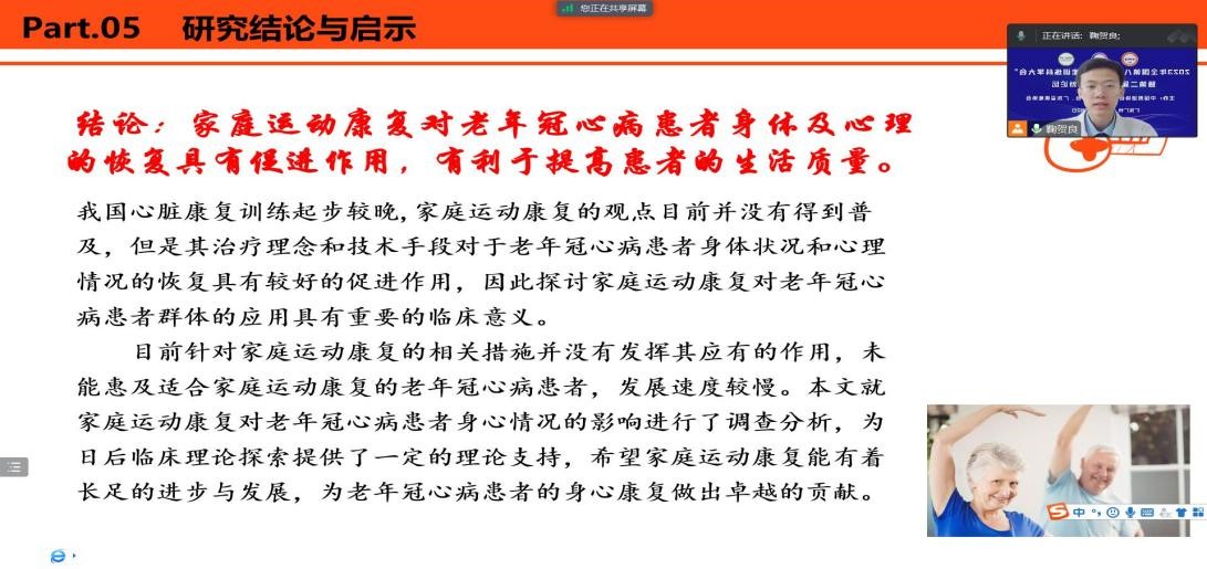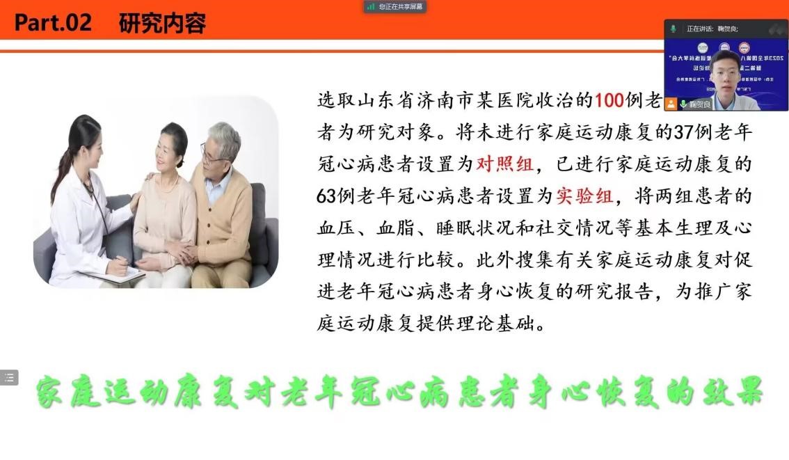 在專題報(bào)告會(huì)上,鞠賀良同學(xué)以《家庭運(yùn)動(dòng)康復(fù)對(duì)老年冠心病患者身心恢復(fù)效果的調(diào)查研究》為主題進(jìn)行匯報(bào),梳理并找出家庭運(yùn)動(dòng)康復(fù)對(duì)老年冠心病患者身心恢復(fù)有無具體明顯的效果,進(jìn)而針對(duì)性地提出家庭運(yùn)動(dòng)康復(fù)對(duì)老年冠心病患者身體及心理的恢復(fù)具有促進(jìn)作用的結(jié)論。