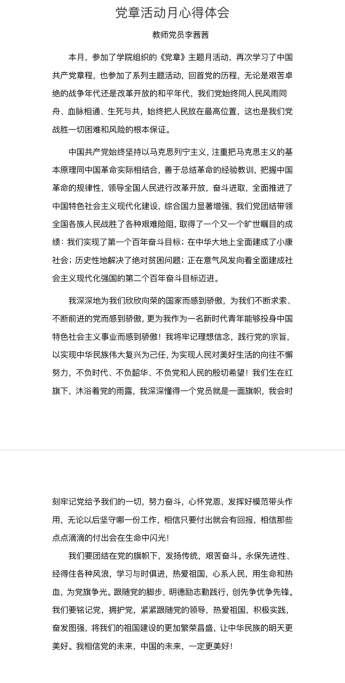 “《黨章》主題月”活動為保持基層黨組織和黨員先進性夯實了理論基礎,是學習貫徹黨章的起點和基石。在學院黨組織的堅強領導下,上下聯(lián)動,務實創(chuàng)新,努力在全院營造學習貫徹黨章的濃厚氛圍,正確引導全體黨員同志迅速投入到學習貫徹黨章的熱潮當中,認真學習黨章,自覺遵守黨章,切實貫徹黨章,堅決維護黨章,更好地帶領全體黨員為學院的發(fā)展和全面建設和諧社會做出自己的貢獻!