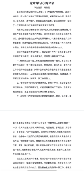 為深入有效開展“《黨章》主題月”活動,引導黨員學原文、悟原理,直屬黨支部組織黨員開展了手抄《黨章》活動?!啊饵h章》主題月”活動期間,每位黨員抄寫《黨章》,并撰寫心得感悟一篇。黨員同志們以“手抄”這種方式來學習黨章,一筆一劃書寫著初心和使命。在抄寫過程中,黨員們還結合個人經(jīng)歷和工作實際,認真思考,并將所感所悟以手寫形式記錄下來。這既是對黨章的一次重新學習認識,也是黨員們增強自身理論修養(yǎng)的一次機會。在抄《黨章》、寫感悟的過程中,進一步引導廣大黨員“學、思、行”統(tǒng)一,以學促行,知行合一。