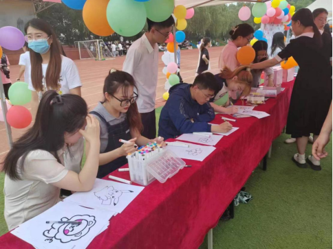 活動現(xiàn)場設置心語區(qū)、趣味競賽區(qū)和特色活動展區(qū)三大活動區(qū)域。繪制“自畫像”和交換“祝?!钡刃恼Z區(qū)活動供學生進行沉浸式心理體驗;“車輪滾滾”和“花樣賽跑”等趣味競賽區(qū)氛圍緊張而激烈、加油聲此起彼伏,同學們在團隊游戲中充分合作,感受團結就是力量。