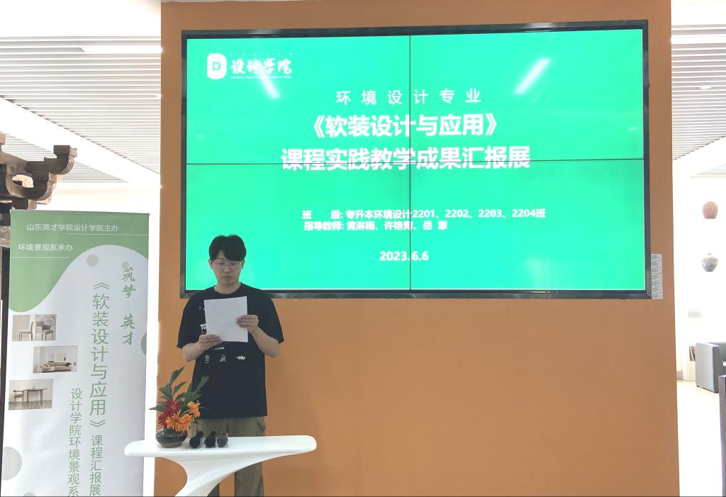 學(xué)生代表李浩辰同學(xué)就課程學(xué)習(xí)過程及心得進(jìn)行發(fā)言。學(xué)生提到,他們非常珍惜本次展覽機(jī)會,通過學(xué)習(xí)這門課程掌握了軟裝設(shè)計的基本知識、基本造型規(guī)律和軟裝模型的基本制作技巧。提高了三維空間的建筑空間的視覺表達(dá)能力和軟裝設(shè)計審美意識。