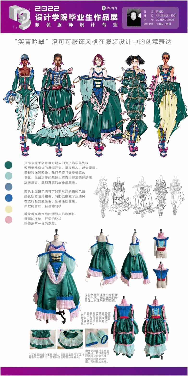 本設(shè)計靈感來源于洛可可時期人們?yōu)榱俗非竺赖綐O致而束縛身體的極端行為,包括緊身胸衣、超大裙撐、繁瑣裝飾等。作者希望打破束縛,解放身體,保留甜美的基礎(chǔ)上將自由健康的運動感與甜美集合,呈現(xiàn)真實的生命健康美。作品采用端莊富貴的緞面面料突出服裝整體的優(yōu)雅華貴,加以層層登疊的薄透紗質(zhì)面料,做出一種朦朧的美感。將洛可可服飾風(fēng)格運用到現(xiàn)代服裝設(shè)計中,為服裝設(shè)計提供了源源不斷的素材,為洛可可服飾風(fēng)格賦予一種新的精神內(nèi)涵。