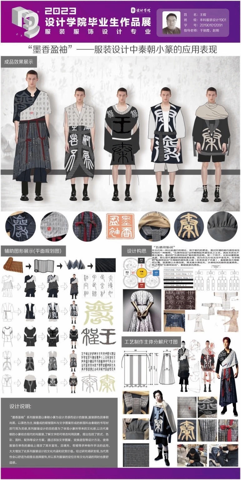 中國文化源遠(yuǎn)流長,筆墨元素不僅僅是一種視覺符號,更是傳達(dá)民族精神和內(nèi)涵的載體。文字為現(xiàn)代服裝設(shè)計提供了豐富的設(shè)計形式和多樣的裝飾手法。使用文字作為圖案裝飾,在現(xiàn)代服裝中將漢字書寫、拓印在服裝上使其有一定的裝飾功能。此次課題在于研究秦朝的小篆即秦篆在現(xiàn)代時尚服裝中的表現(xiàn),運用小篆作為方向和現(xiàn)代時尚服裝相結(jié)合設(shè)計,探索設(shè)計出傳承中華文化的時尚服裝,讓中華文字美學(xué)在服裝設(shè)計中碰撞發(fā)出更為精彩的火花。