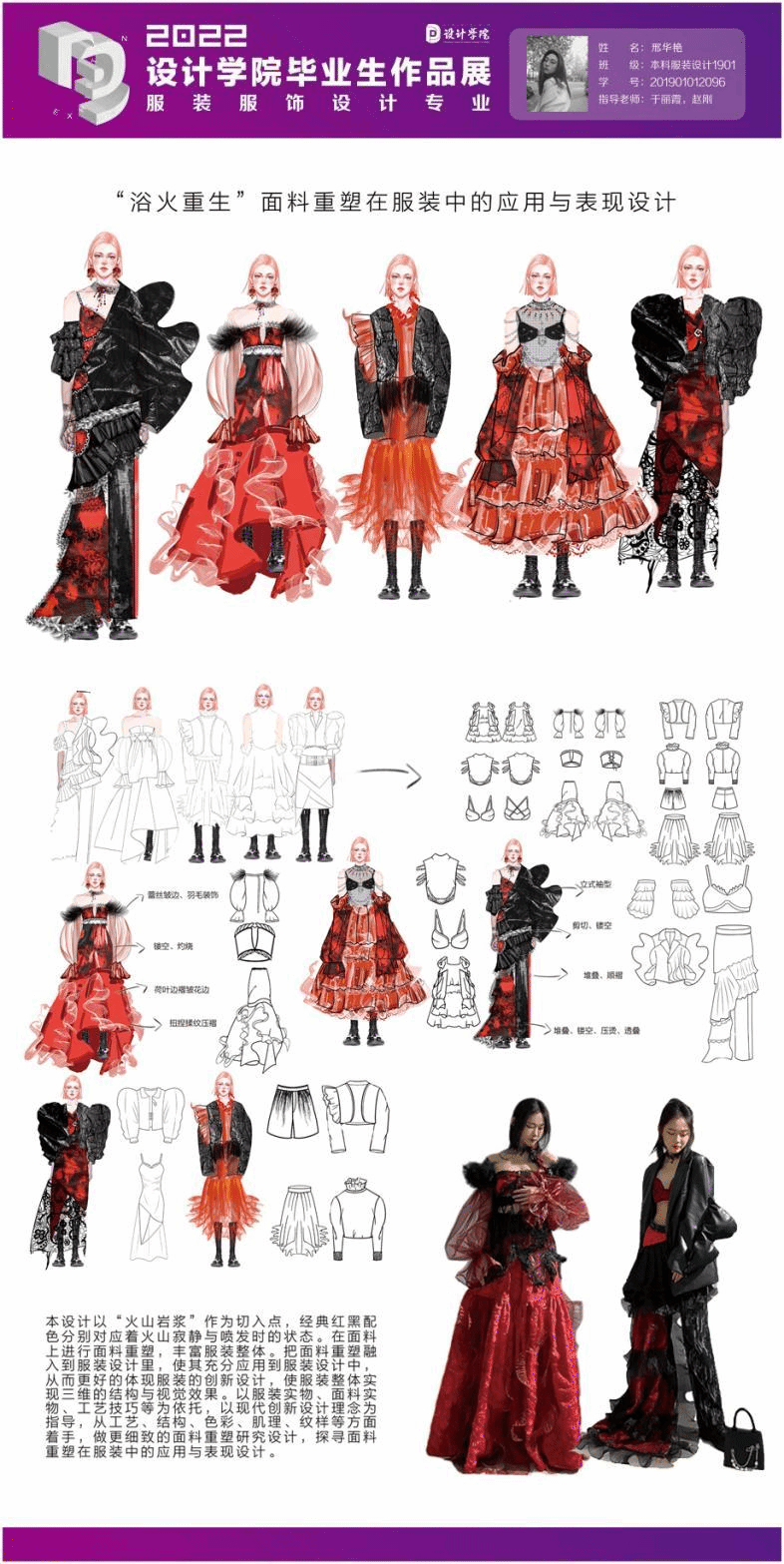 本設(shè)計以“火山巖漿”作為切入點,采用經(jīng)典的紅色與黑色分別對應(yīng)火活躍噴發(fā)時的狀態(tài)和休眠時期的沉寂。在面料設(shè)計方法,利用蕾絲的網(wǎng)眼效果將紅與黑兩種色彩進(jìn)行融合,采用堆疊、灼燒等方式進(jìn)行服裝面料的二次設(shè)計,豐富服裝層次性。將面料再造融入服裝整體設(shè)計中,從而更好地展現(xiàn)服裝的立體效果,同時表達(dá)設(shè)計主題。