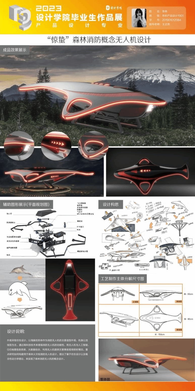 外觀采取仿生設(shè)計(jì),以海豚的形體作為消防無人機(jī)的主要造型外觀,機(jī)身以流線型為主,通過高科技技術(shù)來增強(qiáng)消防無人機(jī)的功能性,將無人機(jī)與人工智能、GIS地理信息系統(tǒng)、大數(shù)據(jù)結(jié)合,利用無人機(jī)提供災(zāi)害事故現(xiàn)場(chǎng)即時(shí)情況。重點(diǎn)研究如何構(gòu)建用于森林火災(zāi)監(jiān)測(cè)的無人機(jī)設(shè)計(jì),提出了基于仿生設(shè)計(jì)以及概念性動(dòng)力學(xué)理論,來實(shí)現(xiàn)了森林消防無人機(jī)的概念設(shè)計(jì)。