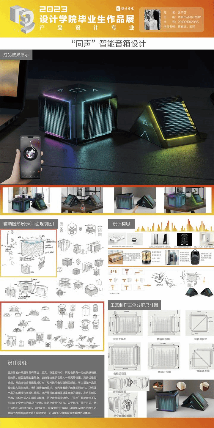 正方體的外觀通常具有簡(jiǎn)潔、堅(jiān)實(shí)、穩(wěn)定的特點(diǎn),同時(shí)也具有一定的美感和視覺效果。顏色選用的是黑色,它的好處在于它給人一種沉靜穩(wěn)重、高貴優(yōu)雅的感覺,并且比較容易搭配其燈光,燈光選用色彩斑斕的顏色,可以增加產(chǎn)品的趣味性和視覺效果,吸引消費(fèi)者的眼球,燈光隨著音樂的律動(dòng)而變化,以保證產(chǎn)品的實(shí)用性和美觀性兼顧。該產(chǎn)品頂部玻璃面板是音箱的屏幕,發(fā)聲孔部位凸出,形似半插入的悶銷格角榫,兩個(gè)音箱磁吸組合。