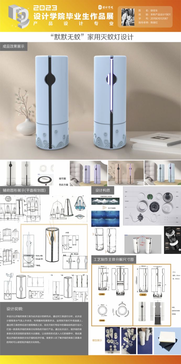 本設(shè)計(jì)以濟(jì)南趵突泉三泉為此次設(shè)計(jì)的研究點(diǎn),通過對(duì)三泉進(jìn)行分析,此次設(shè)計(jì)提取泉水氣泡上升狀態(tài),利用趣味性展現(xiàn)手法,運(yùn)用到滅蚊燈外觀。選題上,通過將三泉的特征進(jìn)行提取概括之后,結(jié)合滅蚊燈特征中的基礎(chǔ)結(jié)構(gòu)進(jìn)行設(shè)計(jì),打造一款具有濟(jì)南趵突泉文化特色的滅蚊燈產(chǎn)品。通過此次設(shè)計(jì),使?jié)硝劳蝗铎`活現(xiàn)地呈現(xiàn)在大眾眼前,以全新的形式進(jìn)入人們的視野中,借此展現(xiàn)出濟(jì)南趵突泉的文化價(jià)值和經(jīng)濟(jì)價(jià)值,使更多人在了解濟(jì)南趵突泉三泉景點(diǎn)的同時(shí)可以感受到濟(jì)南的文化特色。
