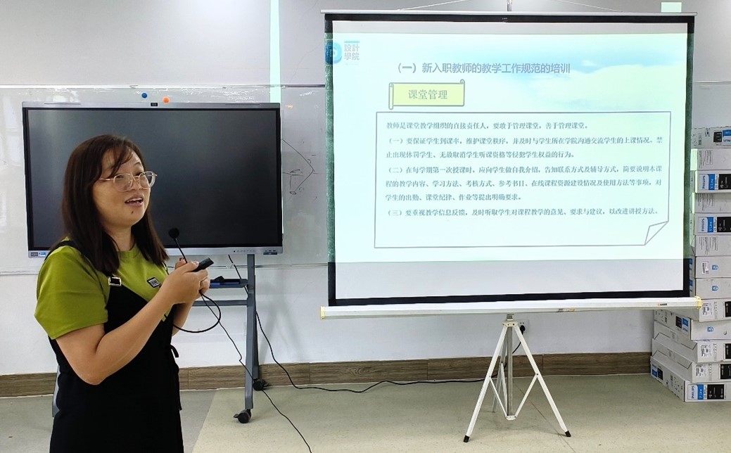 教學(xué)副院長(zhǎng)郝瑩對(duì)新老師介紹了設(shè)計(jì)學(xué)院教學(xué)相關(guān)制度和規(guī)范進(jìn)行了深入解讀。從教師“備課常規(guī)要求”“教學(xué)常規(guī)要求”“作業(yè)布置批改要求”“課外輔導(dǎo)常規(guī)要求”“考試常規(guī)要求”“教學(xué)研究常規(guī)要求”“實(shí)踐活動(dòng)常規(guī)”等方面向新教師講解了具體內(nèi)容。并鼓勵(lì)大家積極參與學(xué)院組織的新教師崗前試講、新教師磨課、過講課關(guān)、老帶新一對(duì)一幫扶等專題教學(xué)活動(dòng)中,全面提升新聘教師的教育教學(xué)能力和水平,爭(zhēng)做新時(shí)代的做好“四有”好老師。