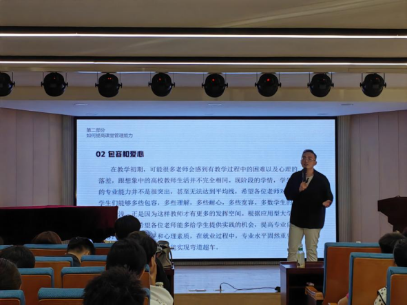 音樂教研室主任李泓廷以“提升班級管理和課堂管理能力”為主題,結(jié)合課堂教學(xué)實例,以風(fēng)趣幽默的語言形式對新聘教師如何處理課堂問題及如何管理學(xué)生介紹了自己的心得體會。