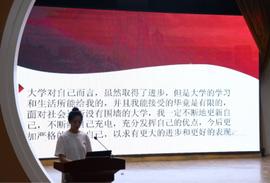 會(huì)議伊始,王書(shū)記圍繞國(guó)家獎(jiǎng)學(xué)金、省政府獎(jiǎng)學(xué)金設(shè)立的意義,答辯會(huì)議的流程及規(guī)則要求進(jìn)行了詳細(xì)的介紹。13位候選人根據(jù)現(xiàn)場(chǎng)抽簽順序依次上臺(tái)答辯,在答辯過(guò)程中,他們分別從個(gè)人學(xué)習(xí)情況、榮譽(yù)獎(jiǎng)項(xiàng)、思想政治方面、社會(huì)實(shí)踐方面等多角度進(jìn)行了自我展示,自信滿滿的話語(yǔ)間展現(xiàn)了我院學(xué)子一心向?qū)W的良好學(xué)風(fēng)和朝氣蓬勃的精神面貌。
