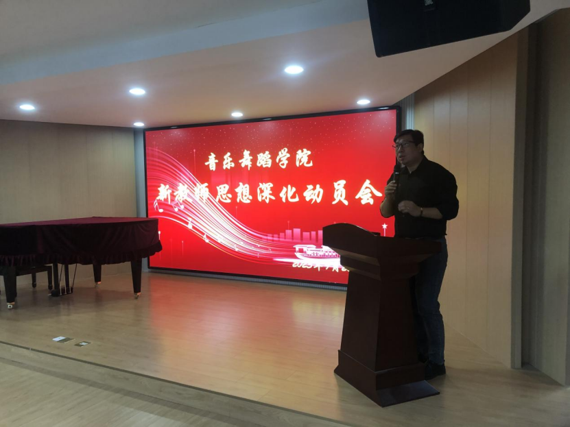 為進(jìn)一步加強(qiáng)學(xué)院新教師隊(duì)伍建設(shè),落實(shí)新教師思想深化主題教育,提升新教師積極、穩(wěn)定、扎實(shí)工作的意識(shí),9月26日,音樂舞蹈學(xué)院在藝體中心多功能廳召開了新教師思想深化動(dòng)員會(huì),學(xué)院院長吳可畏、執(zhí)行院長鞏麗及全體新、老教師參加了此次動(dòng)員會(huì)。