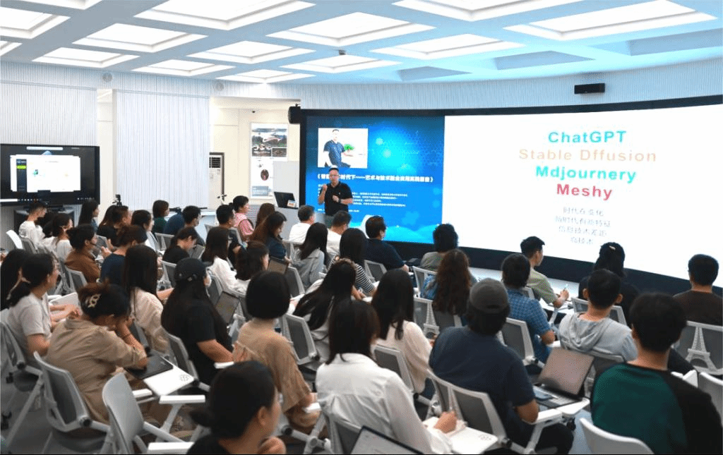 院長周長積代表設計學院全體教師對李教授的到來表示誠摯的感謝與歡迎。講座中,李教授首先介紹了智能數(shù)字時代的背景,隨著科技的飛速發(fā)展,人工智能、大數(shù)據(jù)等技術在各個領域的應用逐漸深化,對藝術與科技領域的影響也日益顯著。表示智能數(shù)字時代為藝術與技術的融合提供了前所未有的機遇,同時也帶來了新的挑戰(zhàn)。在探討藝術與技術的融合應用實踐方面,數(shù)字化技術為藝術創(chuàng)作提供了更多可能性,提出學生和老師都可以利用先進的智能數(shù)字技術手段,打破傳統(tǒng)藝術的界限,創(chuàng)造出更具創(chuàng)新性和互動性的作品。此外,李教授還現(xiàn)場互動了ChatGpt等人工智能軟件的實際應用案例,展示了藝術與技術融合的魅力。