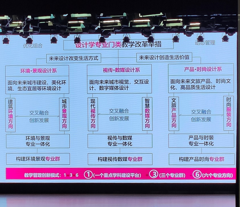 在學(xué)科建設(shè)、專業(yè)融合、強化特色等方面,進行了大膽的探索與改革:拓展了1個“設(shè)計學(xué)”省級重點學(xué)科平臺,構(gòu)建了3個領(lǐng)域的專業(yè)群(系),組建了6個動態(tài)互補的專業(yè)方向,形成了“1+3+6”的專業(yè)教學(xué)模式。