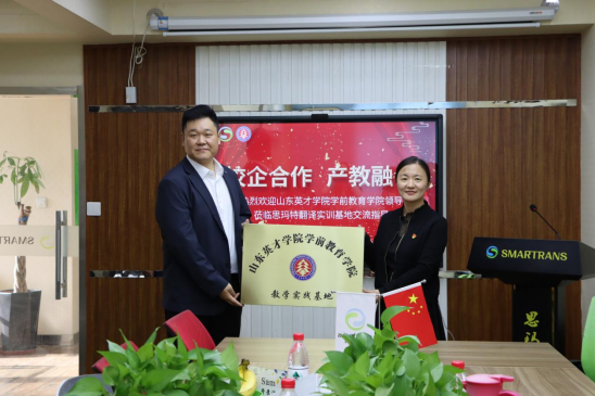 鄭雯與屈楊簽訂了《山東英才學(xué)院畢業(yè)生就業(yè)基地建設(shè)框架協(xié)議書(shū)》,王靜為企業(yè)授牌。